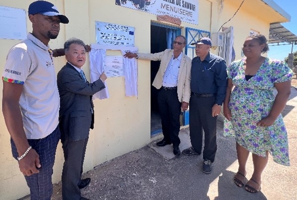 2025年11月26日、グラン・ラ・フッシュ・マングにて令和6年度の草の根・人間の安全保障無償資金協力「ロドリゲス島職業訓練校機材整備計画」の引渡式が執り行われ、菅大使とグランクーフ・ロドリゲス自治長、ラヴィナ・ロドリゲス地区若者協議会代表、ラヴィナ青少年スポーツ委員長をはじめ多くの関係者が多数出席しました。
